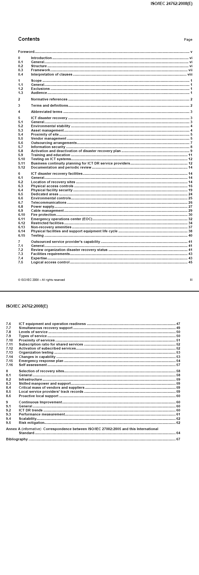 ISO/IEC 24762 ist die internationale Norm, die Richtlinien für die Bereitstellung von ICT Disaster Recovery (ICT DR) Diensten im Rahmen des Business Continuity Managements (BCM) enthält.
