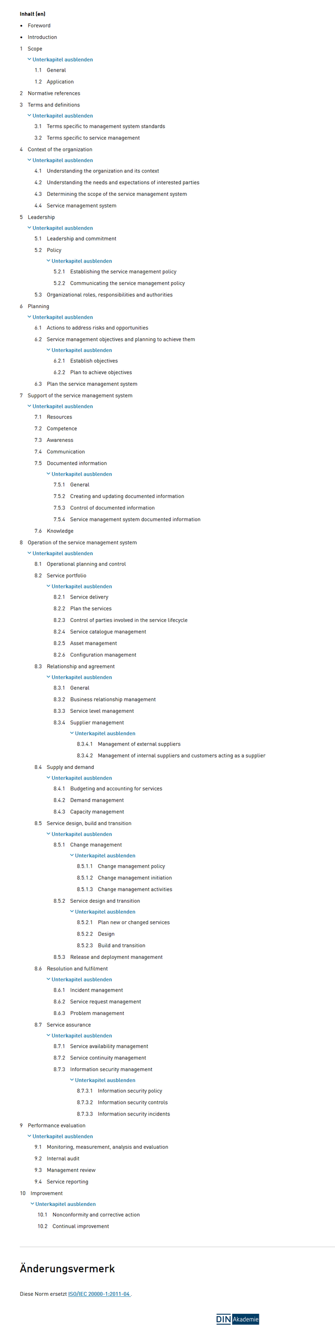 - ISO/IEC 20000 Part 1 – „Service Management System Requirements“