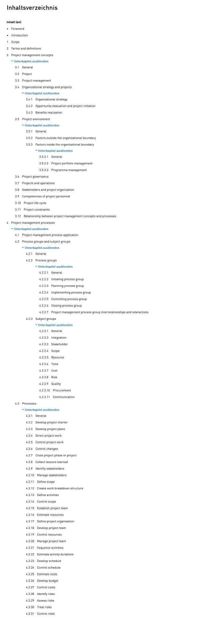 Inhaltsverzeichnis ISO 21500