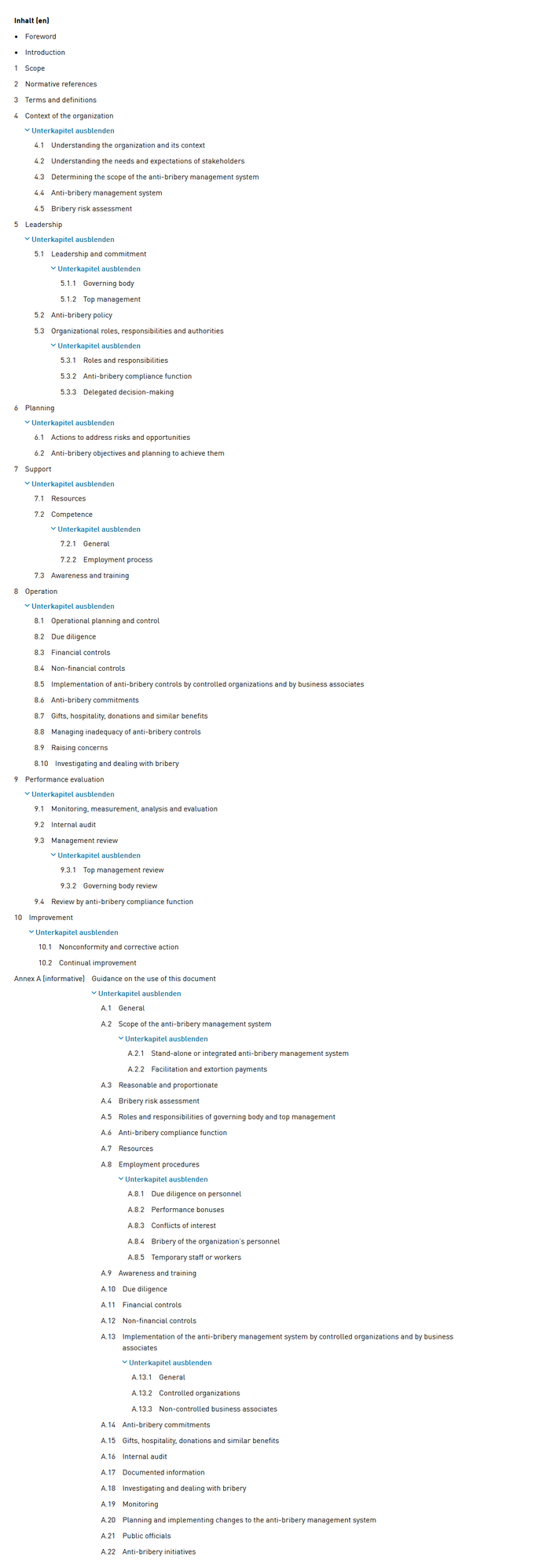 Inhaltsverzeichnis ISO 37001